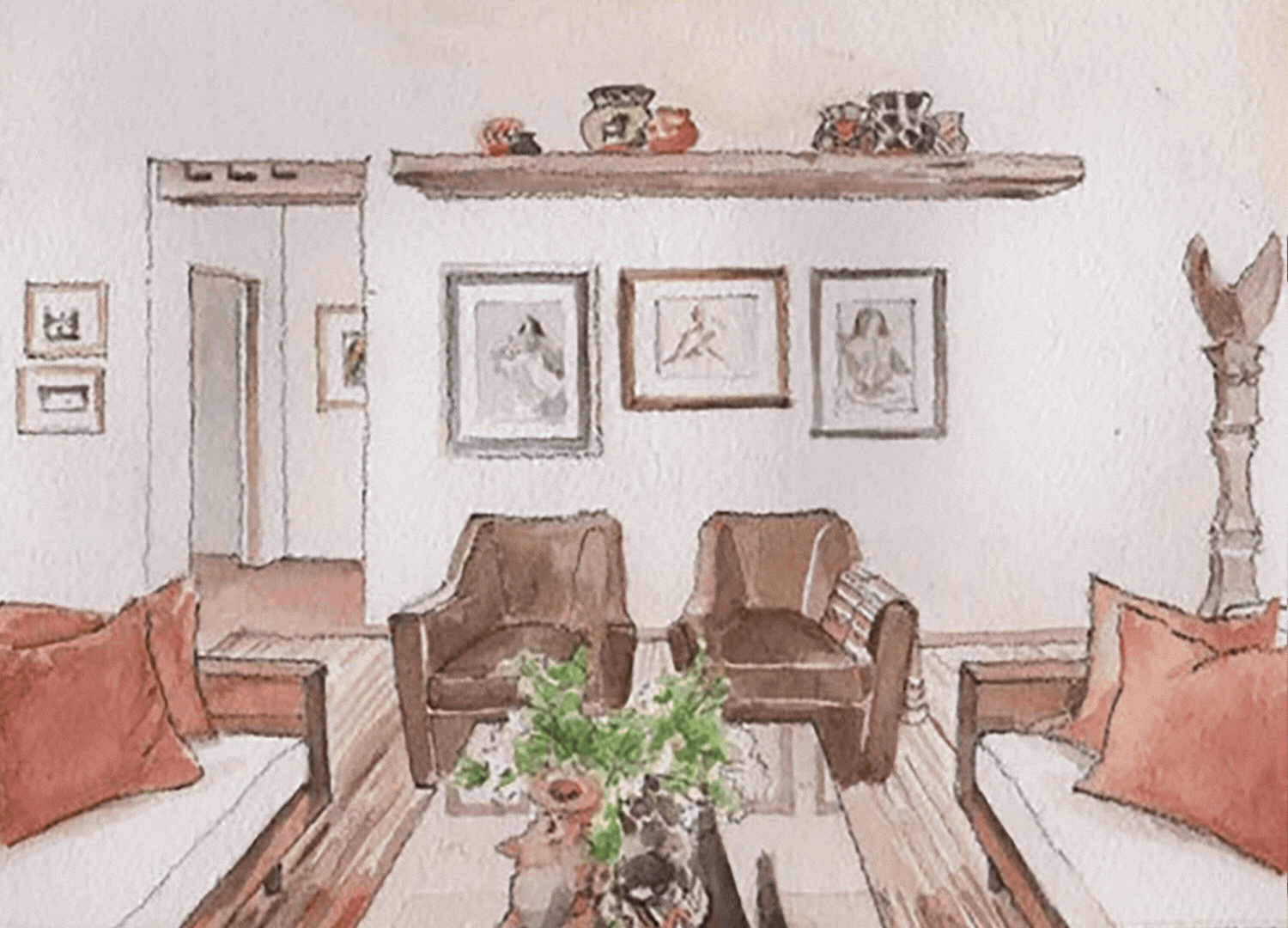 The spectacular views of this home, seen from nearly every window, lend as the perfect inspiration for its interior. Natural materials, along with beautiful earth tones and bright terracotta colors, honor the landscape surrounding them. The simple color palate is juxtaposed with a mix of materials and textures to give tremendous visual interest.